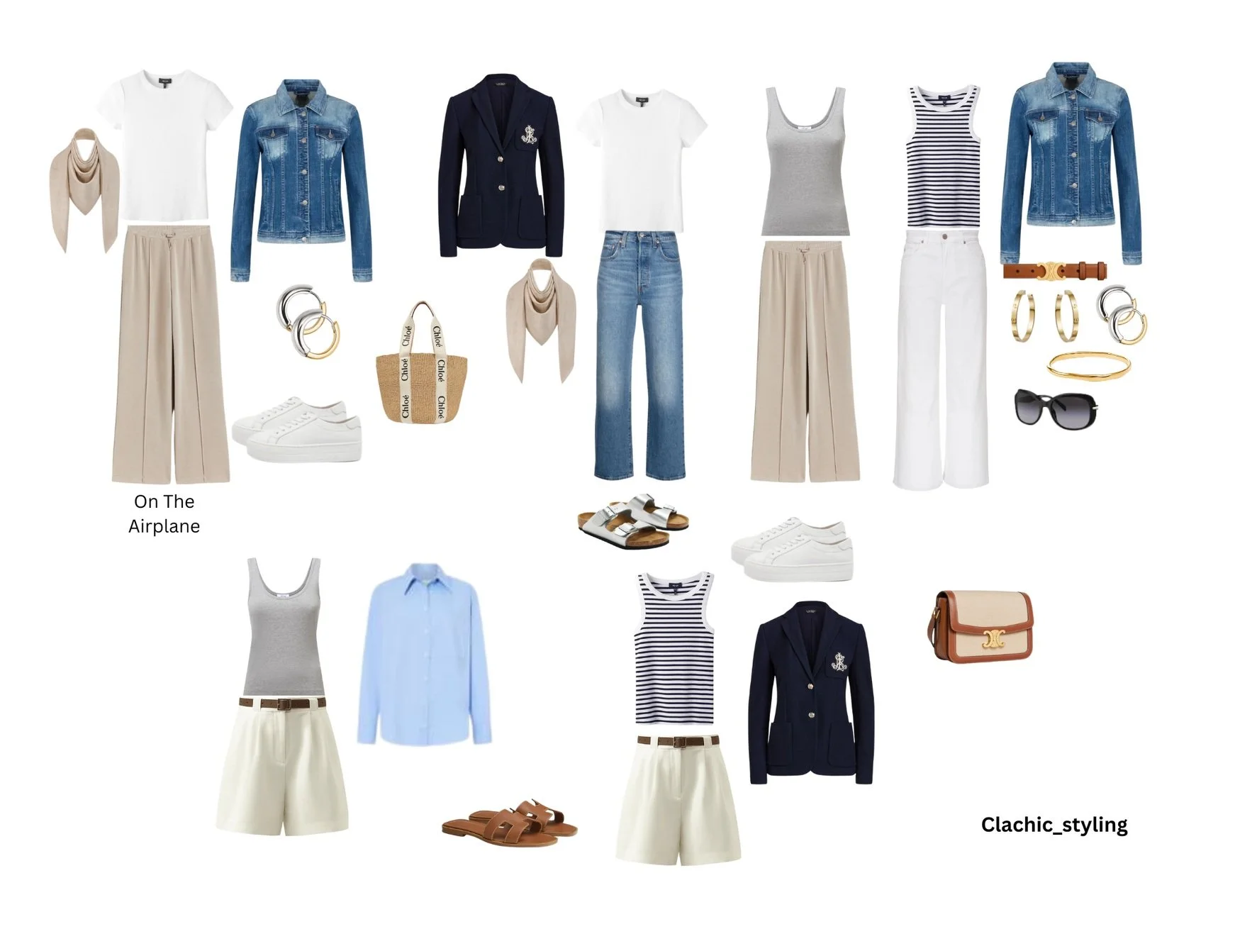 Bottoms: Jeans (A well -fitting pair in blue or white), Casual pants in neutral color, Shorts in neutral color or blue denim.