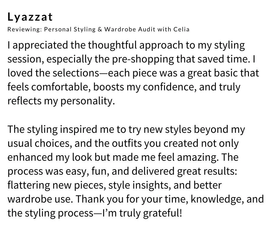 Celia’s approach to fashion styling goes beyond following trends, she believes that true style reflects your personality. By combining her keen eye for details and quality, she will help you to find a style that suits your personality, lifestyle, and body shape. Celia can help you to create a quality wardrobe that will last.